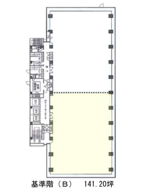 1987年竣工、地上8階地下1階建SRC造のビルです。新耐震基準に適合しています。基準階面積は280.80坪。大型の事務所をお探しの会社によいでしょう。間取りは無柱空間の長方形で、配置の自由度が高いでしょう。EV・駐車場・機械警備・個別空調・OAフロア・貸室外の男女別トイレとちた充実の設備仕様をしています。2008年に共用部・2018年に外装やエントランス等のリニューアルがされ築年数を感じさせない清潔感があります。