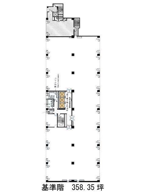 1フロアは最大約360坪の大規模。フロアや募集時期によってフロア2分割などの区画が出る場合がございますので詳細はお問合せくださいませ。エレベーター(3基)・男女別トイレ・給湯室の共有部分は全て室外に集約しています。執務室は共有部分を囲うコの字型の間取りで、出入りの動線は複数確保されています。