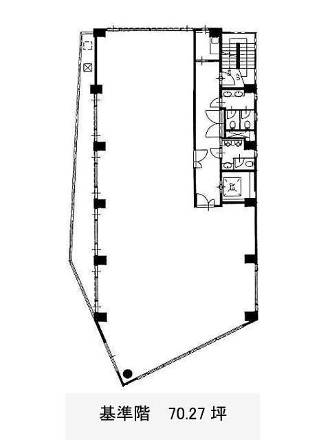 基準階は約70坪、やや変形のL字型ではあるものの、柱は外周に配置されており、床はOAフロア仕様。空間の使い方に自由度があるため、レイアウトは柔軟に検討できます。また、水回りは室外にまとめられているため、執務スペースと生活動線をしっかり分けられるのも嬉しいポイント。個別空調・機械警備・駐車場など、日々の業務を支える設備も整っています。