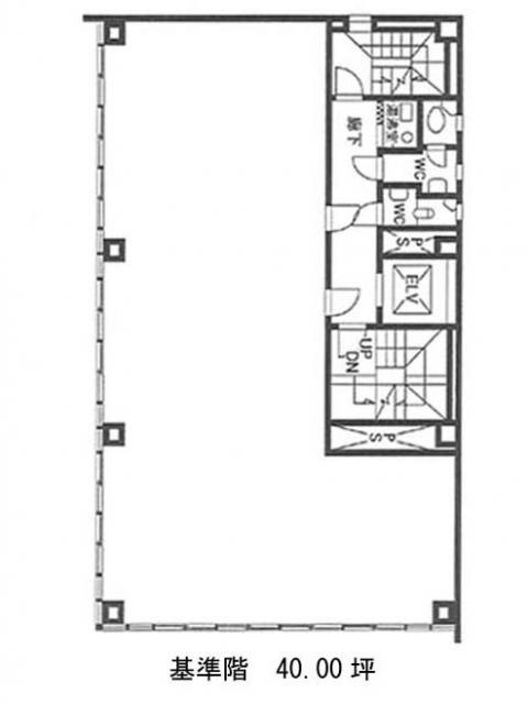 基準の貸室は40坪。執務空間はL字型の無柱空間でオフィスレイアウトを行いやすいでしょう。給湯室と男女別トイレは室外に設けられています。セキュリティは機械警備を導入済み。