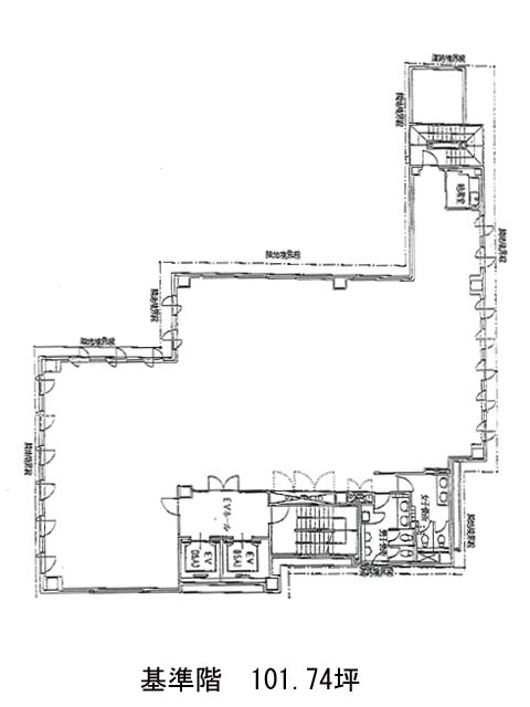 基準階は約102坪。やや個性的な形状ではあるものの、柱は外周に配置されており、OAフロアとあわせて自由度の高いレイアウトが可能です。凹凸を活かして会議室やリフレッシュスペースをゾーニングできる利点も。