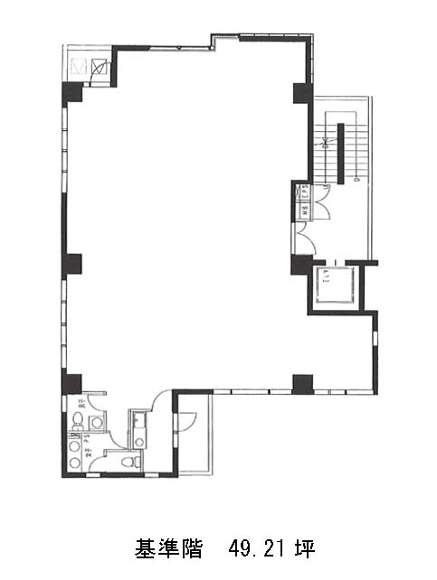 貸室はは約50坪の整形区画・無柱空間で、レイアウトの自由度が魅力。1フロア1テナント構成なうえ、男女別トイレや給湯スペースなどの水回りを貸室内に集約しており、専有性と日常業務の快適さが両立されています。