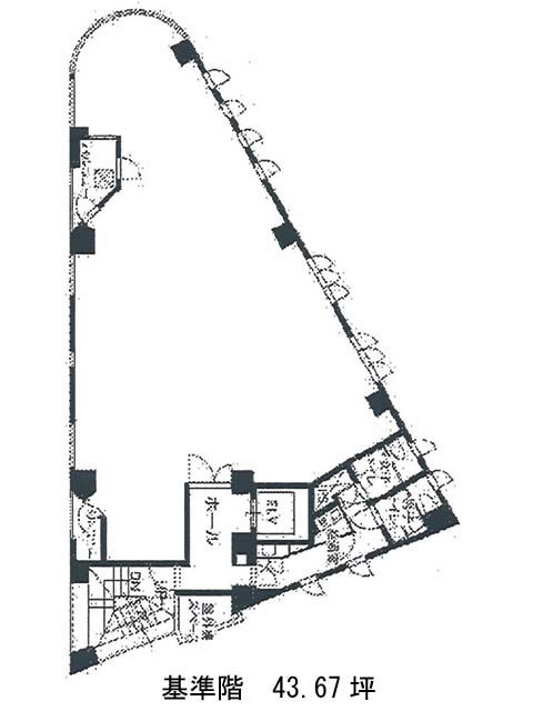基準階は約44坪で、一部が弧を描く三角形に近い間取りが個性的。遊び心のあるレイアウトも実現ができそうです。男女別トイレと給湯室はEVホール脇に集約されており、執務スペースとは明確に切り分けられているため、働く上での動線も良好です。コンパクトながら専用バルコニーも備え、リフレッシュスペースとしても活用可能。感性を大切にするデザイン系企業やベンチャーオフィスなど、空間そのものに価値を求めるテナントにもフィットするでしょう。新宿光ビルディングは新宿三丁目駅(E1番出口)の他に新宿駅(B12番出口)徒歩8分、東新宿駅(A1番出口)徒歩8分で利用も可能です。