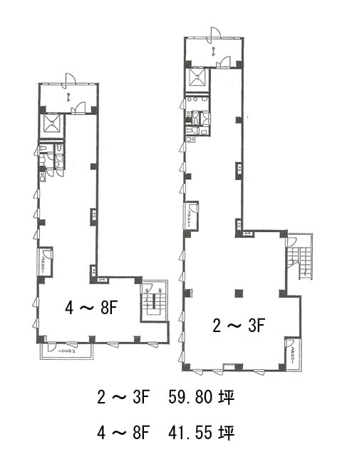 区画は2~3階が約60坪、4~8階が約42坪と2タイプあり、用途や人数に応じた選択が可能。いずれもL字型の間取りです(2~3階は室内に柱があるため、内見時にご確認ください)。セキュリティは機械警備を採用しています。