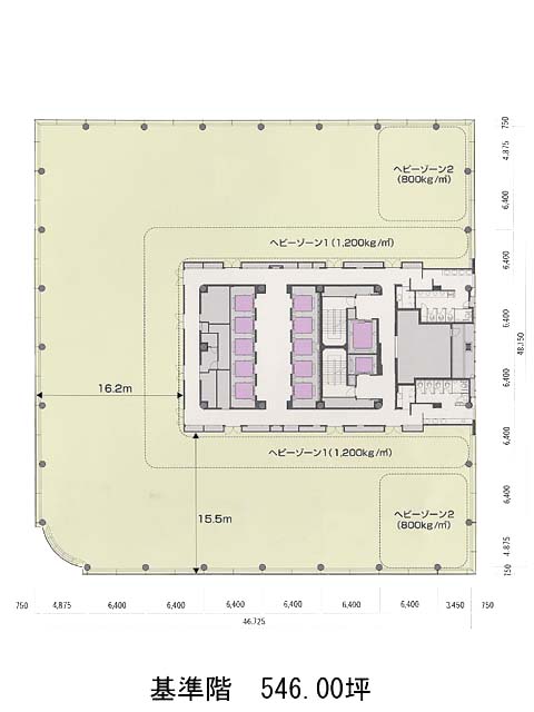 基準階は約546坪と圧巻の広さを誇り、募集時期によっては100坪前後の分割対応も可能。柱のない整形空間はレイアウト効率にも優れ、天井高2,800mm・OAフロアを備えており、快適かつ柔軟なオフィス設計が叶います。また、1,200kg/㎡の耐荷重を確保したヘビーデューティゾーンが設けられており、重量物の設置や特殊なレイアウトニーズにも対応可能です。