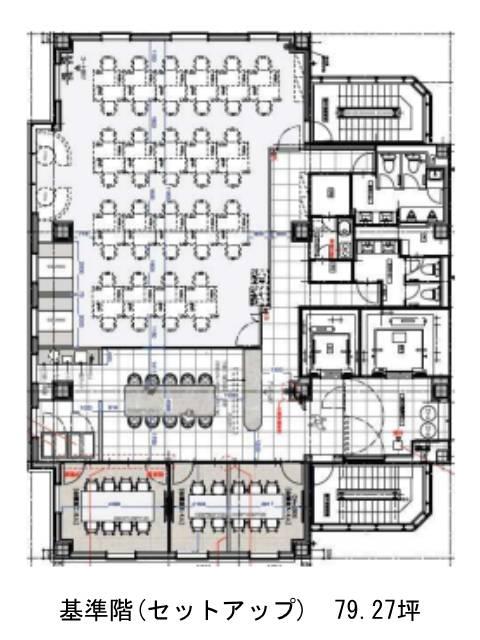 基準階は約79坪の整形無柱空間。レイアウトの自由度が高く、一部フロアには会議室やラウンジスペース、テレカンブースなどを備えたセットアップ区画も用意されています。入居初日から業務を開始できる仕様で、内装コストを抑えたい企業にもおすすめです。