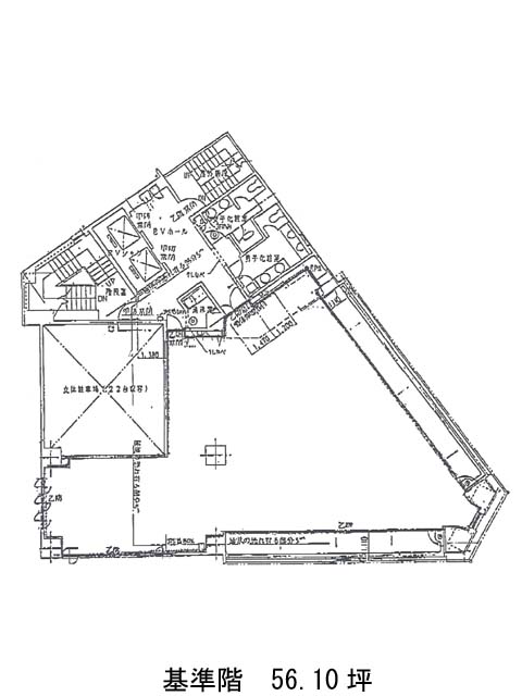 基準階は約56坪。三角形に近い個性的な間取りが特徴。一般的な長方形とは一味違う空間設計は、発想を柔軟に広げるレイアウトにも向いています。床はOAフロア仕様、水回りはすべて貸室外に配置されており、執務空間をすっきりと保つことが可能です。また、機械警備や駐車場も備わっており、安心かつ利便性の高いオフィス環境が整っています。