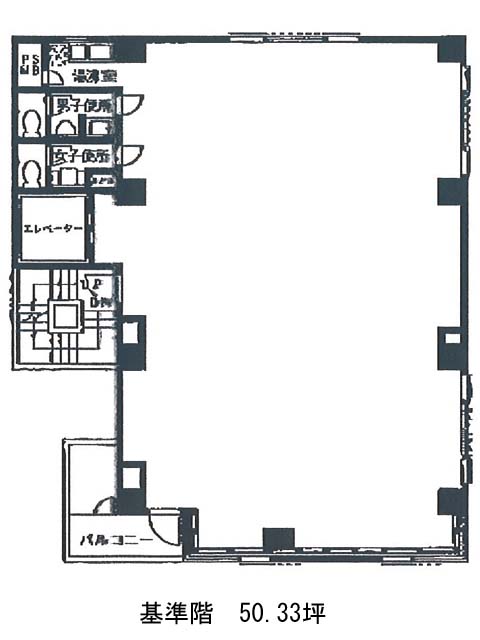 基準の貸室は約50坪の長方形に近い間取り。1基設置済みのエレベーターから執務室へはダイレクトインの仕様です。男女別トイレと湯沸室の水回りも室内にございますが、室内の端にまとめて配置されているため使い勝手は良好かと思います。