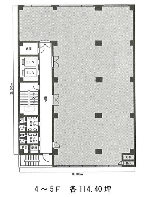 基準階は約114坪と十分な広さがあり、ワンフロアでのゆとりある使い方が可能です。貸室内には柱が数本ありますが、広さを活かして個室や区画の工夫に繋げやすく、柔軟なレイアウトに対応できます。
