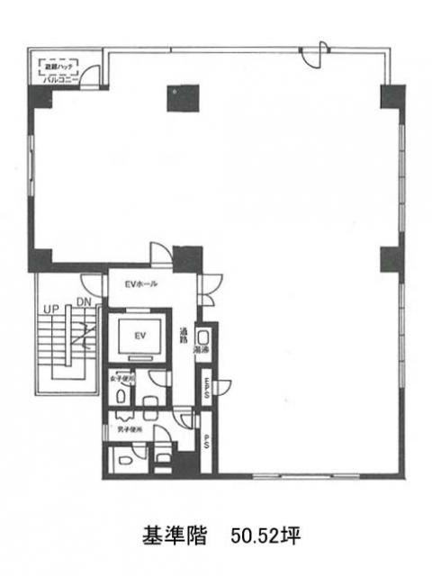 基準階は約50坪のL字型レイアウト。柱が数カ所ありますが、OAフロア仕様のためレイアウトの自由度はしっかり確保されています。男女別トイレは室外に設けられており、利用の際に業務スペースを離れて移動できる点もポイントです。