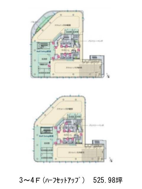 基準階は約262坪。特徴的なのは、執務スペースがエレベーター・水回りのコア部分をぐるりと囲むレイアウトになっている点。ゾーニングしやすく、部署ごとの分離や回遊性を意識したオフィス設計にも対応できます。また、天井高はスケルトン仕様で最大3.7mを確保。開放感があり、クリエイティブ業種や来客の多い企業にも適した空間です。