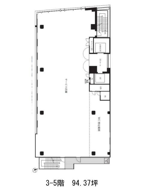 貸室は約94坪の整形空間で、1フロア1テナントの専有型。水回りは室内に集約されており、動線がシンプルで使いやすい設計です。天井高は2,700mmとゆとりがあり、自然光の入る明るい執務環境も魅力のひとつ。