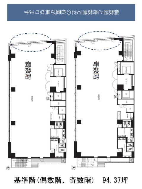 貸室は約94坪の整形空間で、1フロア1テナントの専有型。水回りは室内に集約されており、動線がシンプルで使いやすい設計です。天井高は2,700mmとゆとりがあり、自然光の入る明るい執務環境も魅力のひとつ。