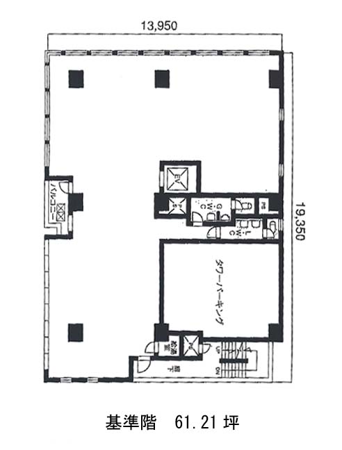 1984年竣工、地上10階地下1階建SRC造のビルです。新耐震基準に適合しています。基壇部はベージュの外壁、上層階は2色のガラス張りですっきりとした外観をしています。基準階面積は61.21坪。中規模のオフィスをお探しの方によいでしょう。室内にダイレクトインのEV・駐車場(タワーパーキング)・個別空調・男女別トイレといった設備仕様がそろい、光ケーブル引込済です。セキュリティとして安心の機械警備が導入されています。