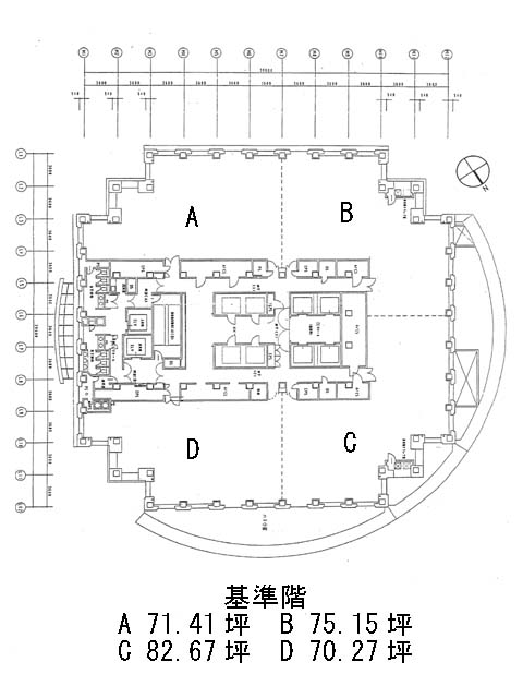 基準階は約300坪。中央にEV・水回りをまとめたコア設計で、4区画(A~D)に分割可能。