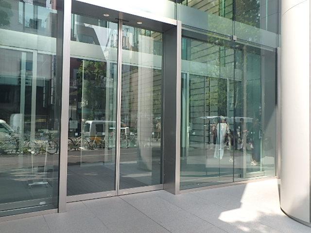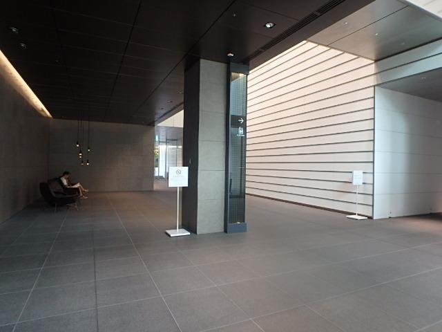 エントランスは石材とガラスを組み合わせた重厚感のある空間で、天井高も確保されており、来訪者を落ち着いた雰囲気で迎えます。